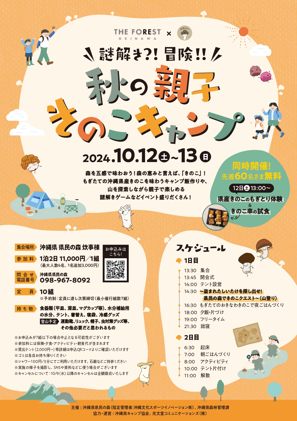 もぎたての沖縄県産きのこを味わうキャンプ飯作りや、山を探索しながら親子で楽しめる謎解きゲームなどイベント盛りだくさん!
