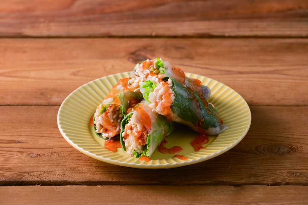 ②水にくぐらせたライスペーパーにハンダマをしき、その上に1と水菜をおいて包む。半分に切り分けて完成♪