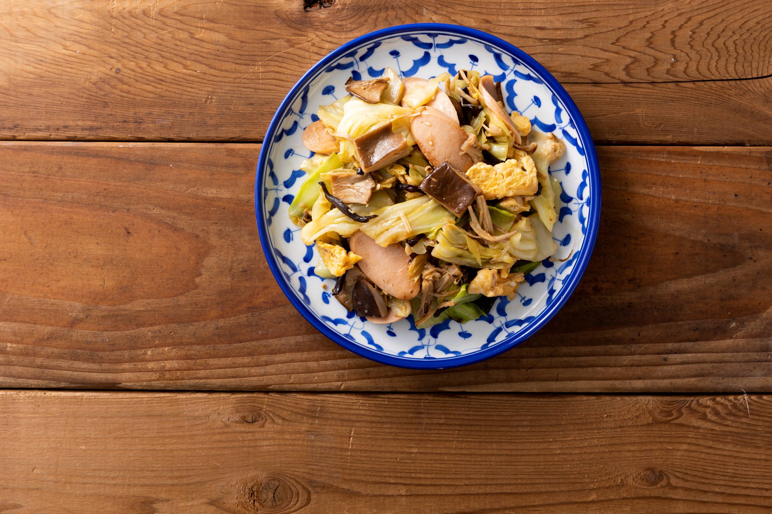 ①あらげきくらげはスライス、くろあわびたけは一口大に切る。えのきたけは石づきを取り、長さを3等分に切る。魚肉ソーセージは5mm幅の斜め切りに、キャベツは一口大に切る。