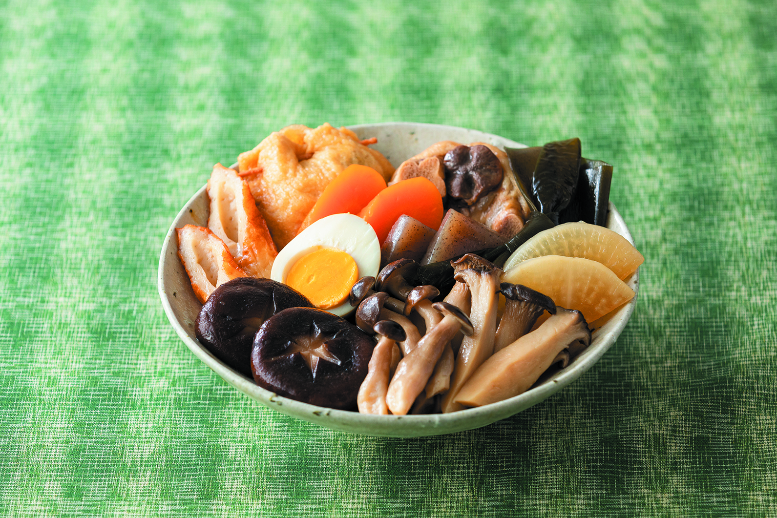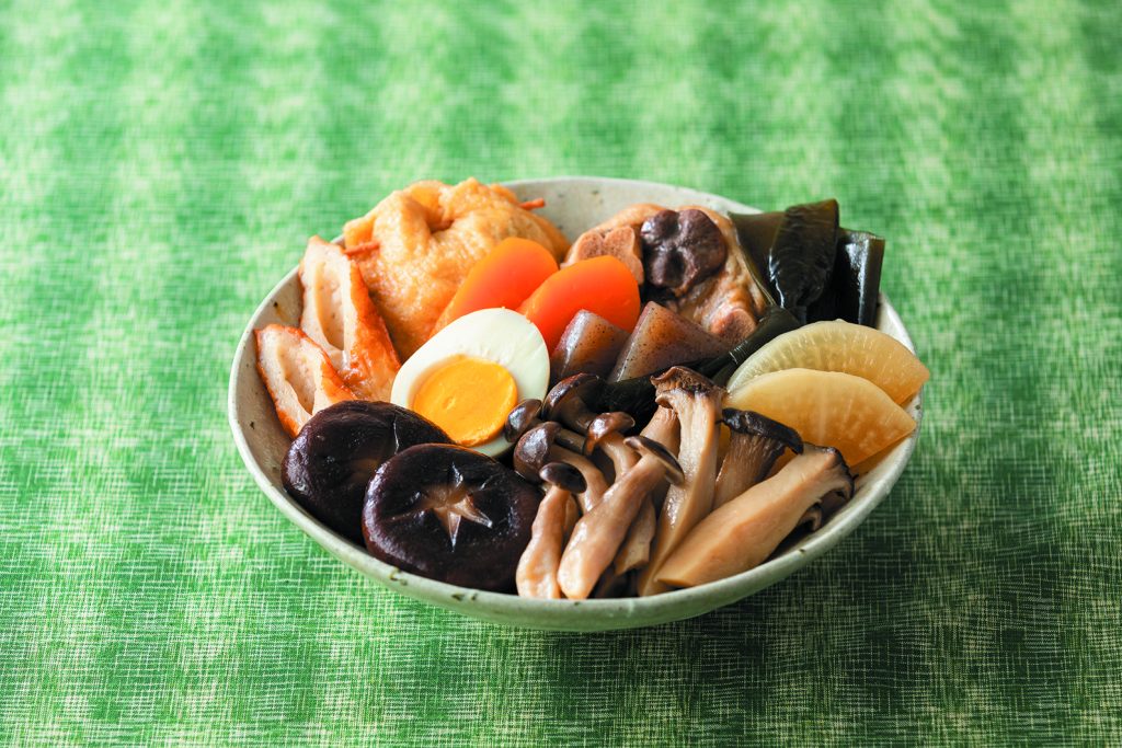 ③大根は厚さ1.5cm程度に切り、隠し包丁を入れ、面取りをして半月切りにする。人参は斜め切り、ちくわは斜めに半分に切る。こんにゃくは半分の厚さに切り、両面に5mm幅の格子状に切り込みを入れ、斜め半分に切る。