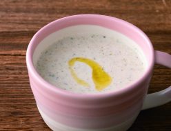②しいたけは軸をとり、5 mm角に切る。軸は石づきをとり5mm角に切る。えのきたけは石づきをとり5 mmの長さに切る。ニラは長さ5mm程度に切る。