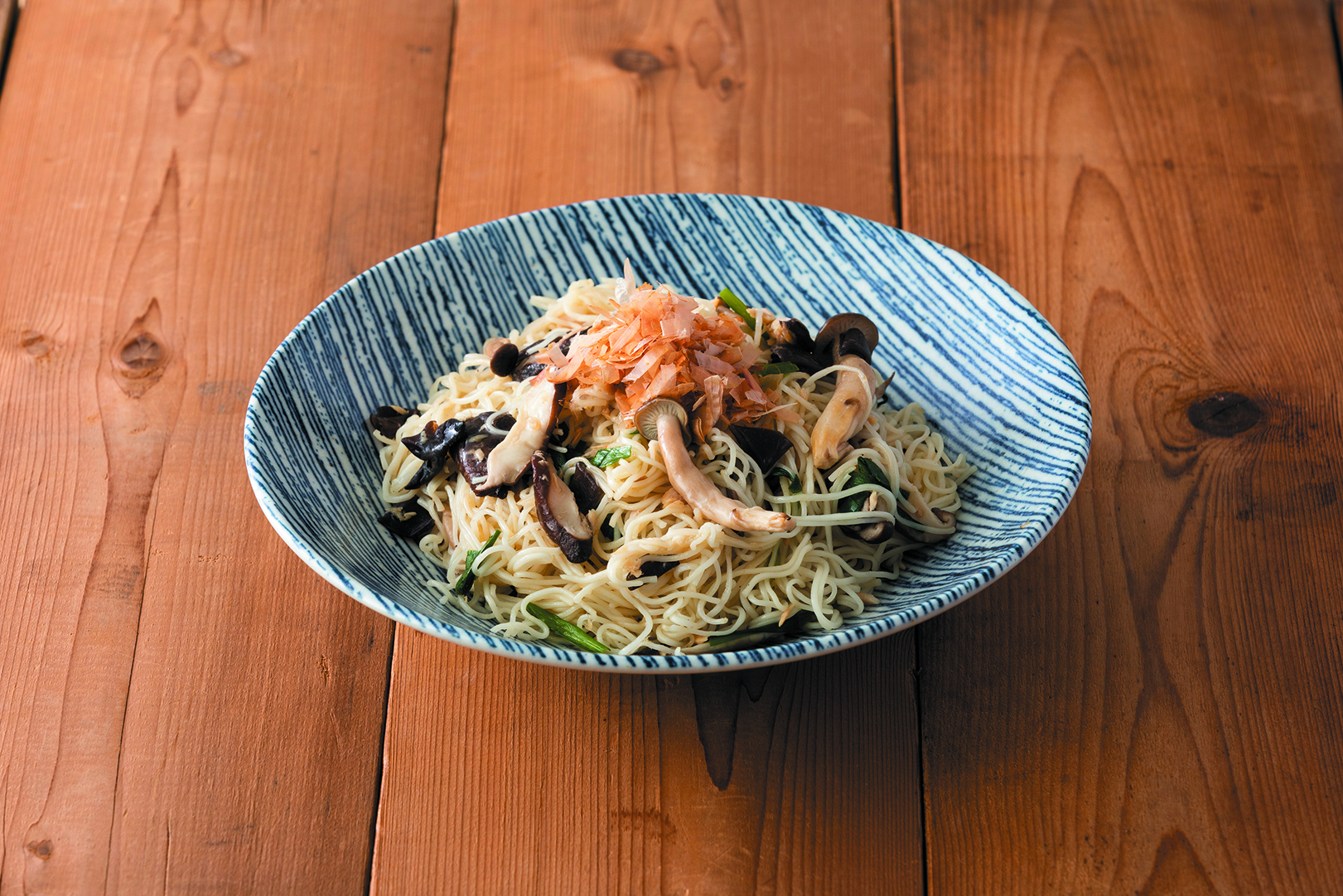 ③フライパンにサラダオイルを温め、先にぶなしめじを中火で炒める。ある程度火が通ったら、あらげきくらげ、しいたけ、ニラを入れて炒め、火が通ったら①を加えてさっと混ぜ、塩、こしょう、和風顆粒だしで味を調える。お皿に盛り付け、かつお節をのせたら完成。