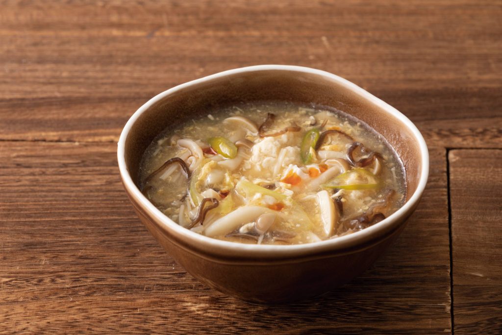 ②小鍋に水500ccときのこを入れて中火にかける。ゆし豆腐・ネギ・Aを入れてひと煮立ちさせ、水溶き片栗粉を入れて混ぜる。