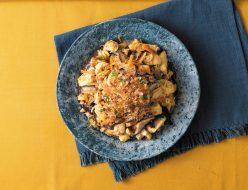 ②フライパンに油を入れて熱し、きのこを炒める。きのこに火が通ったら調味料を加えて弱火にし、汁気がなくなるまで炒める。