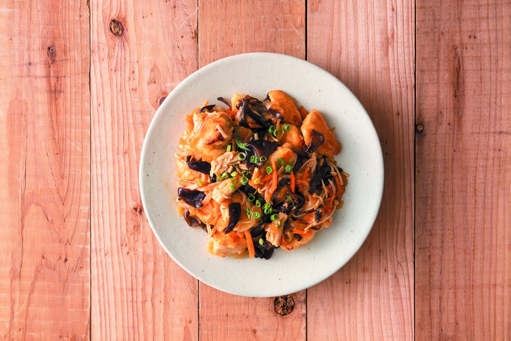 ④フライパンにごま油を熱し、鶏むね肉を入れて中火で焼く。鶏むね肉に火が通ったら野菜を入れて炒め、きのこを加えて2~3分ほど炒める。