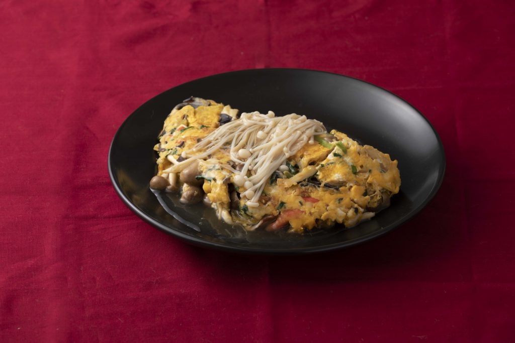 2 熱したフライパンにごま油を入れ、1のあらげきくらげ、にら、ぶなしめじを炒め、卵を流し入れてとじ、一旦皿にあげる。
