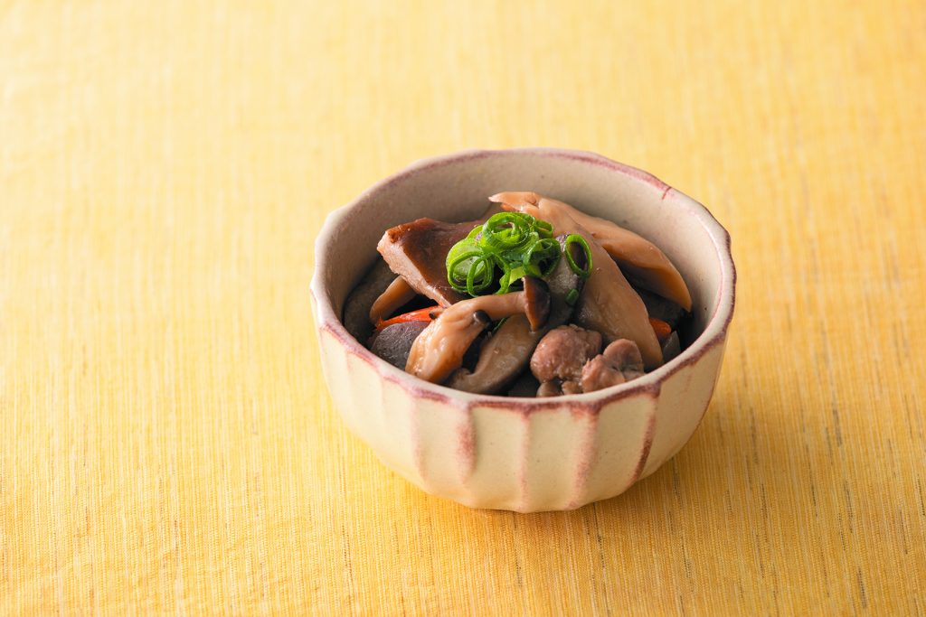 ①ぶなしめじは石づきをとり小房に分ける。エリンギは長さ半分に切り、食べやすい大きさに裂く。くろあわびたけ、しいたけは一口大にカットする。