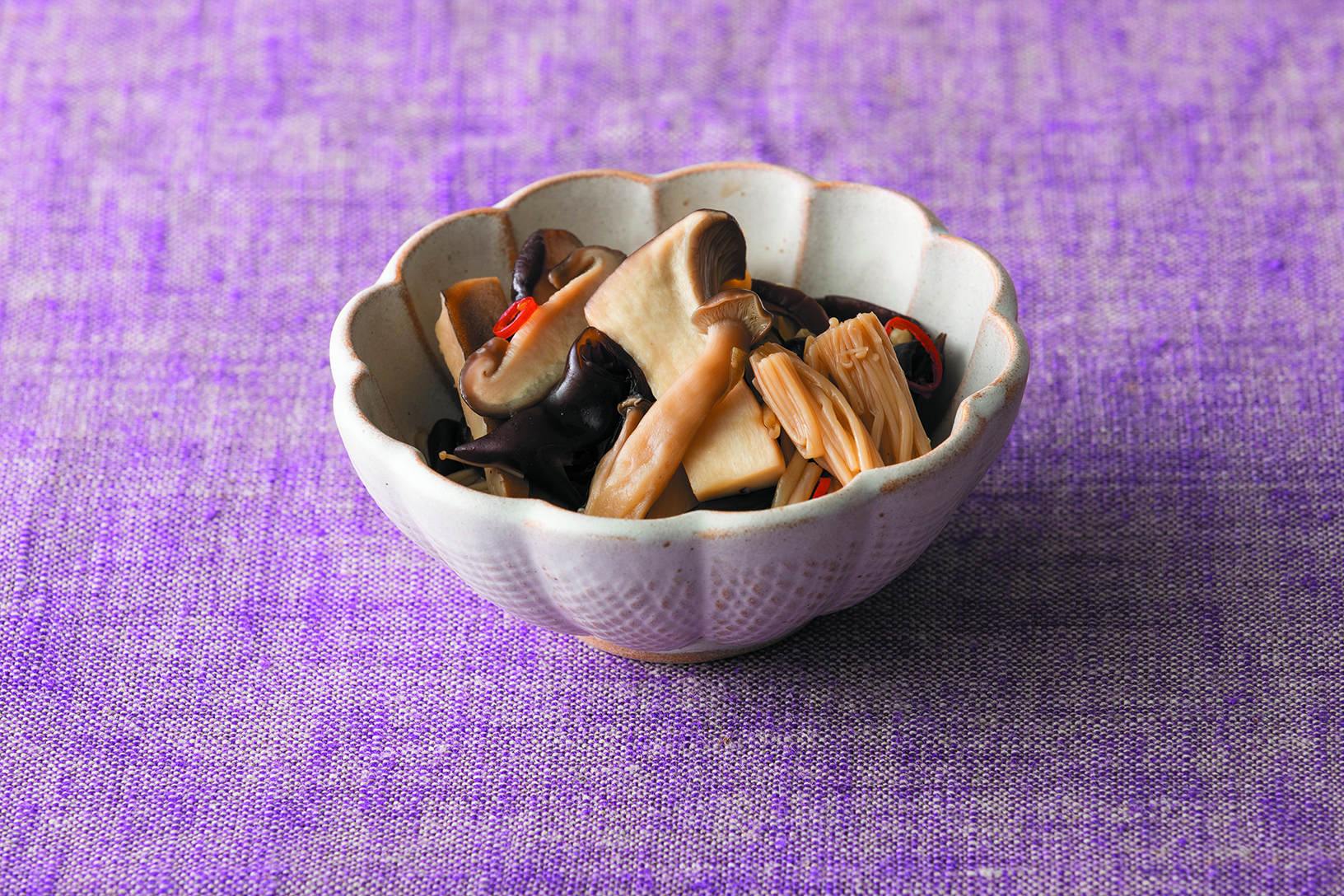 ①ぶなしめじは石づきをとり小房に分ける。えのきたけは石づきをとり、3等分に切る。エリンギは半分に切り、手で食べやすい大きさに裂く。くろあわびたけ、あらげきくらげは1cm幅くらいに切り、しいたけはスライスする。しょうがは千切りにする。