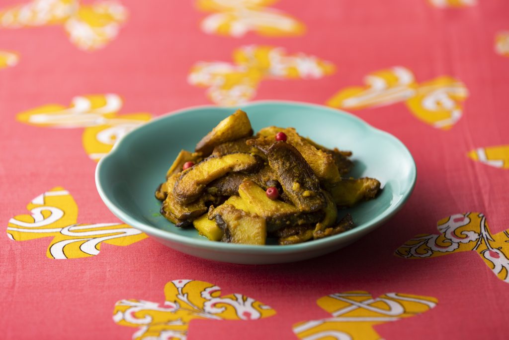 ③しょうが、ニンニクを加えて炒め、ターメリック、塩、酢を加え、全体に味がなじんだら完成。