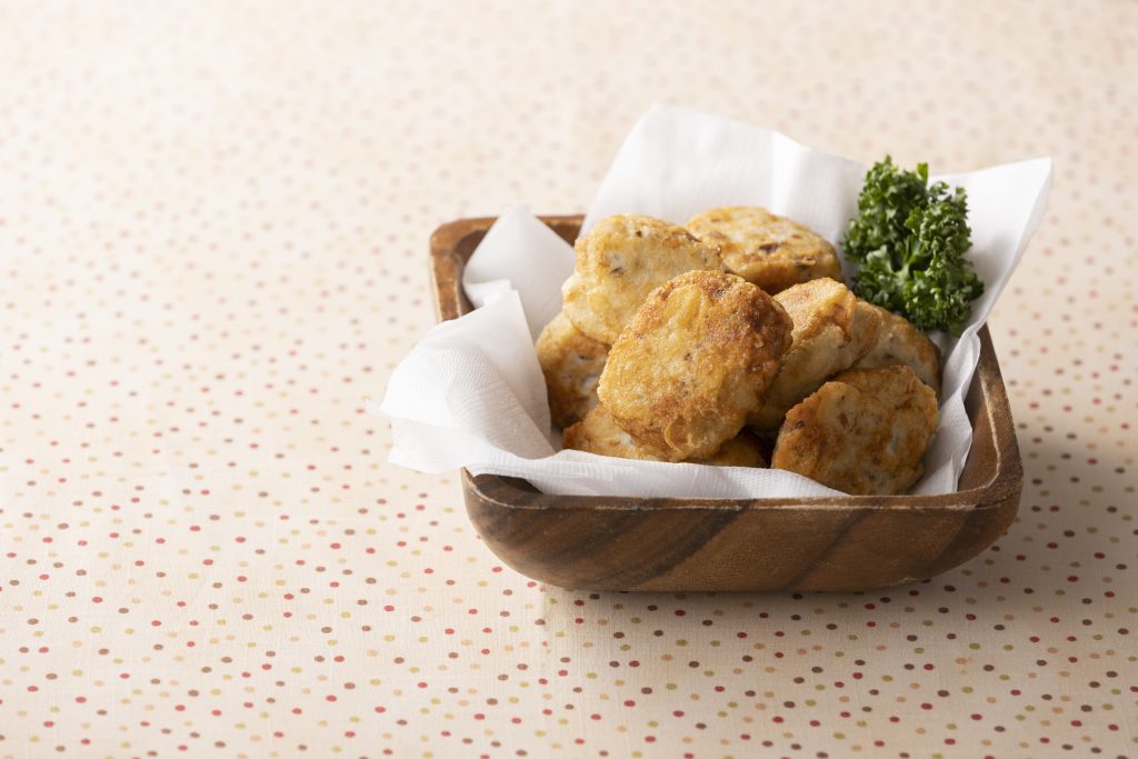 ⑦フライパンに底から1cm程度揚げ油を入れて170℃に熱し、⑥を入れて5分ほど揚げ焼きにする。中まで火が通ったら取り出して完成。