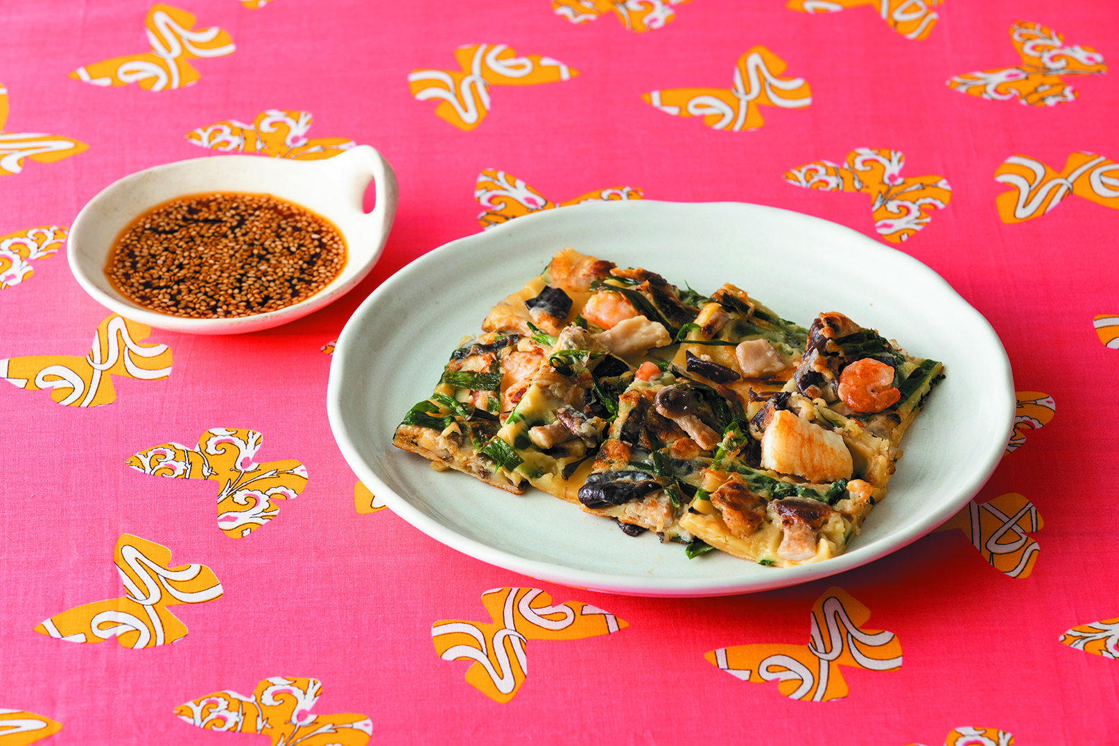 ③フライパンにごま油を中火で熱して、②を入れる。焼き色がつき、縁が固まったら裏返し、中~弱火にして、焦げないように焼く。仕上げ用のごま油を縁から回しかける。こんがり焼き色がついたらできあがり。