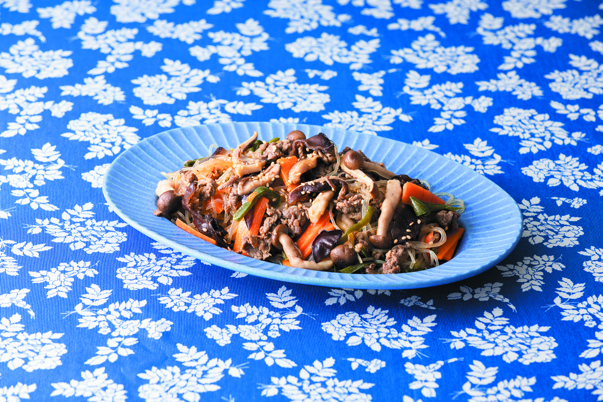 ⑤フライパンにごま油を熱し、牛肉を入れて中火で炒める。肉に火が通ったら、④を入れ中~強火で炒め、③を加えてしんなりするまで炒める。春雨を入れてほぐし炒めたら、Bを入れ、ある程度汁気がなくなるまで炒める。お皿に盛りごまをふりかけたら完成。