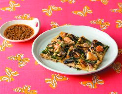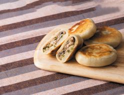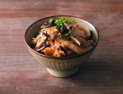 ②熱したフライパンにサラダオイルをひき、牛肉とおろしニンニクを炒める。肉の色が変わったら、玉ねぎを入れて透明になるまで炒め、きのこを加える。火が通ったら焼き肉のタレを入れて混ぜ合わせる。