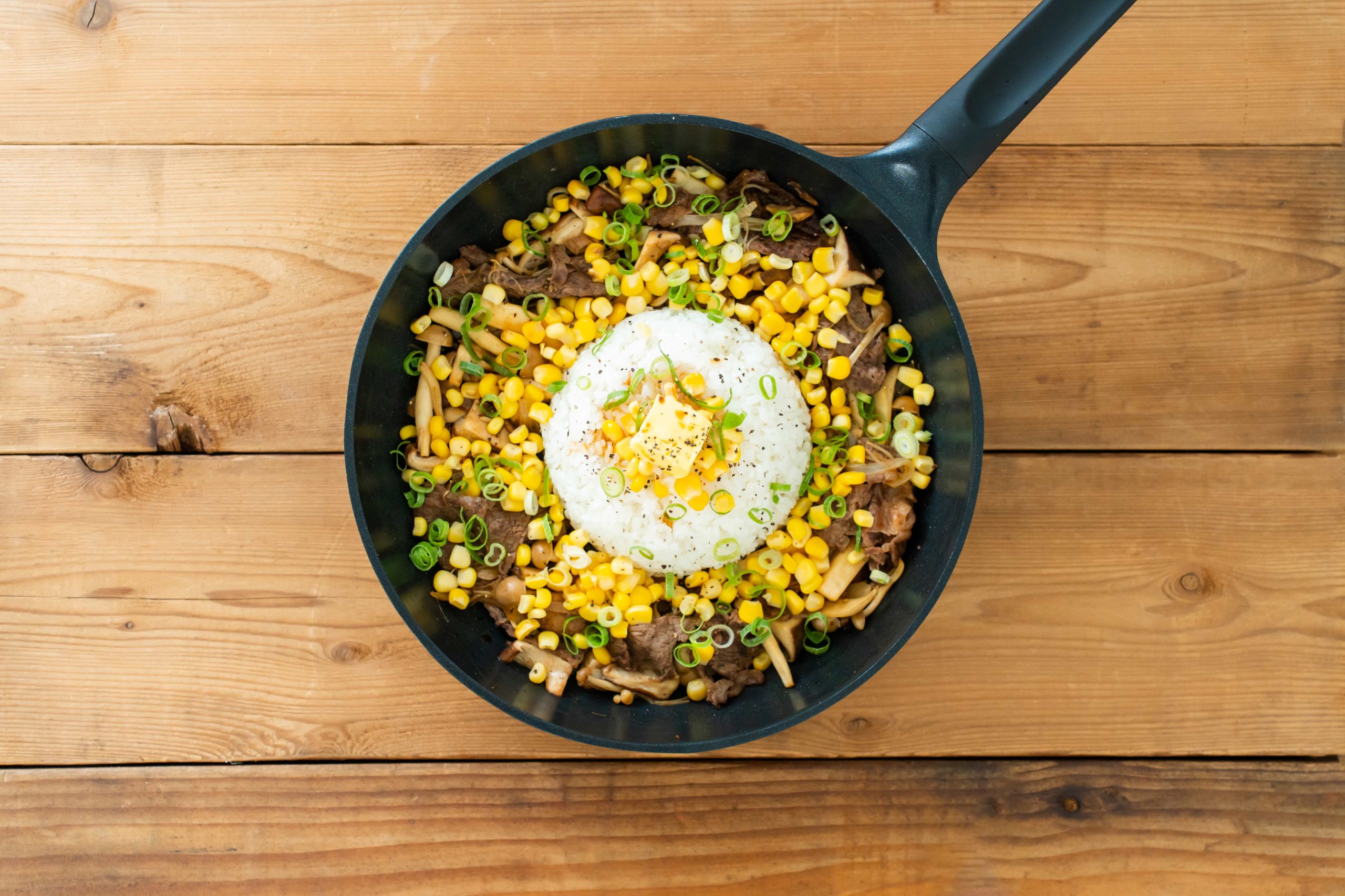 ④スイートコーン、青ねぎを散らし、ごはんの上にバターをのせ、醤油、黒こしょうをかけて完成。