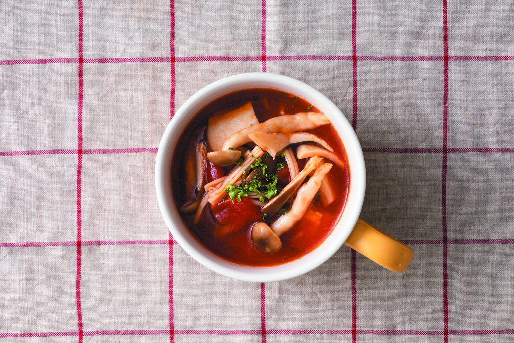 ③鍋にオリーブオイル、ニンニクを入れて弱火で温める。香りが立ってきたら、中火でベーコンを炒め、玉ねぎを炒めて色が変わってきたら、きのこを加えてしんなりするまで炒める。