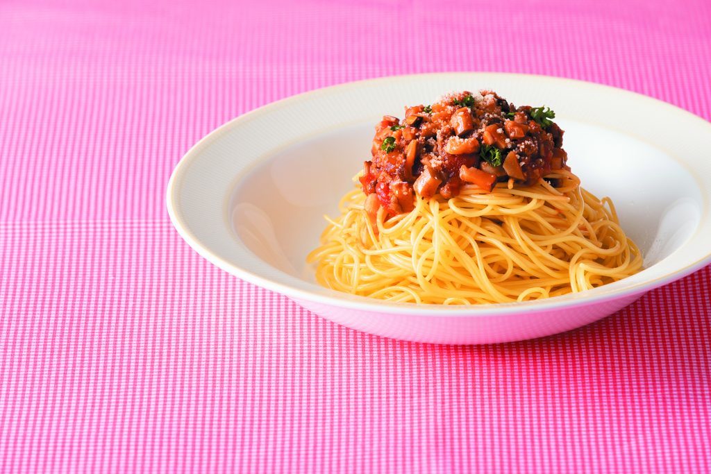 ⑤パスタにミートソースをかけ、お好み量の粉チーズをかけたらできあがり。