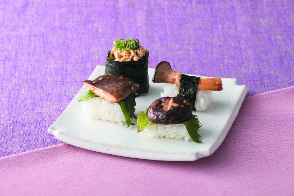 ④俵型にしたごはんの上に青じそをのせ、しいたけ、くろあわびたけをそれぞれのせる。エリンギは細長く切った焼きのりで巻く。