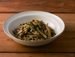 ②ぶなしめじ、えのきたけは石づきを取り小房に分ける。しいたけは石づきを取る。