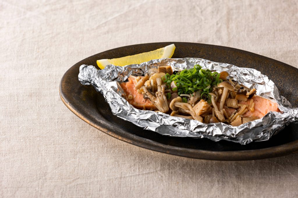 ③アルミホイルに鮭を入れ、きのこを敷き詰めたら(A)を入れて包む。