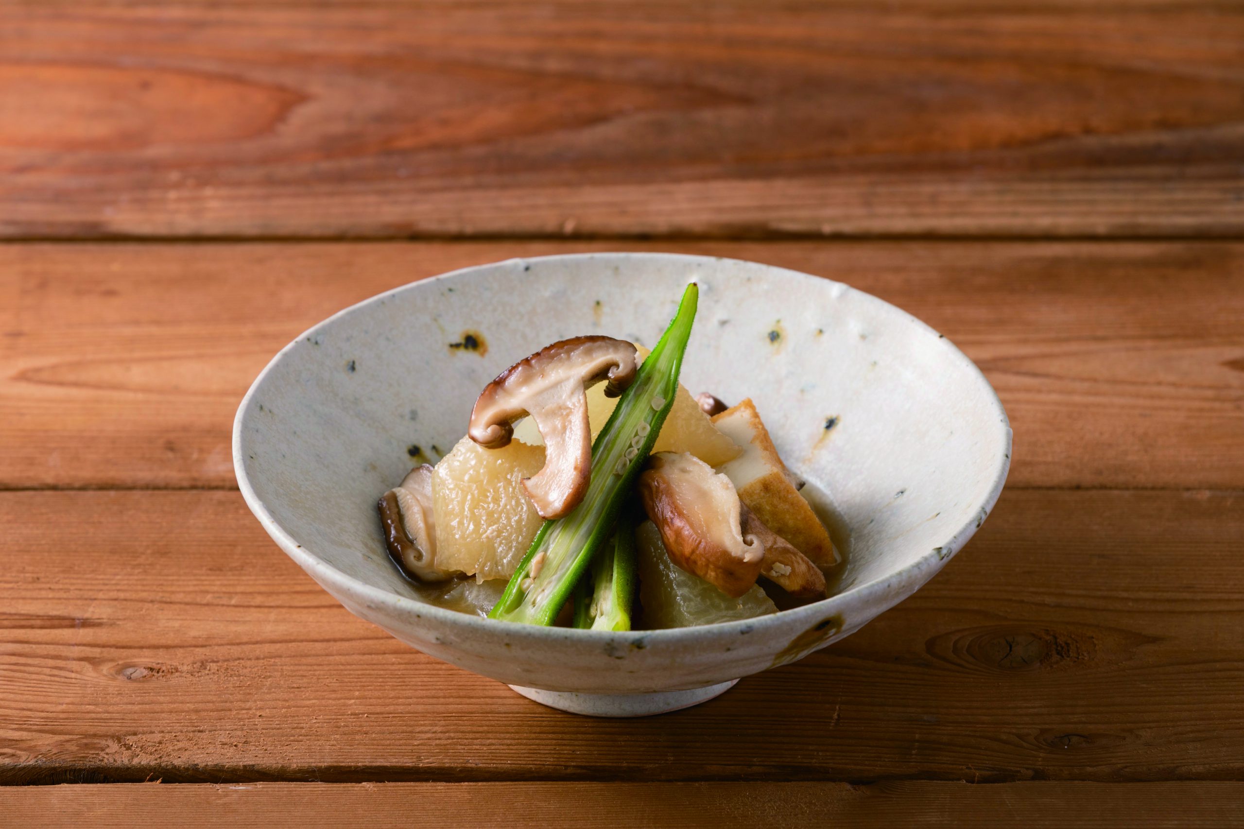 ②しいたけは縦に4等分に切り分ける。厚揚げは食べやすい大きさに、オクラはガクを取って板ずりしたら半分に切り分ける。
