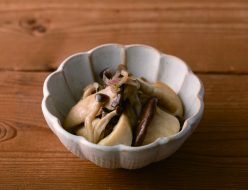 ①きのこの石突きをとる。しいたけは5mm幅で細切りにし、ぶなしめじはほぐしておく。えのきたけは半分に切り分ける。豚肉は1cm幅に切る。長芋は、皮をむいてすりおろしておく。