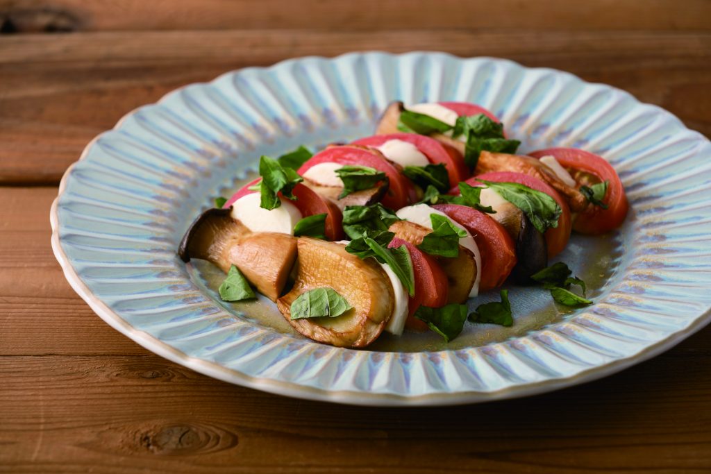 ③お皿にトマト・チーズ・エリンギの順で並べ、冷蔵庫で冷やす。食べる直前にバジルを散らして完成♪