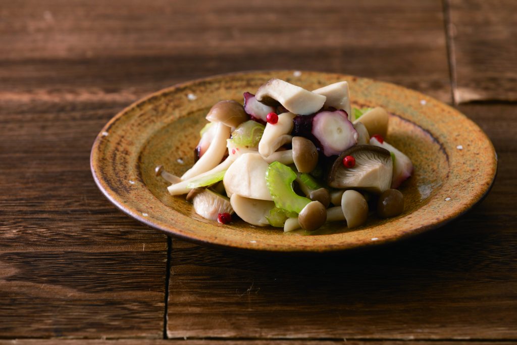 ①タコは一口大に切り落とし、水に入れて塩抜きする。エリンギは縦半分に切り分けて乱切りに、ぶなしめじは石突をとってほぐしておく。セロリは、筋をとって薄切りにする。