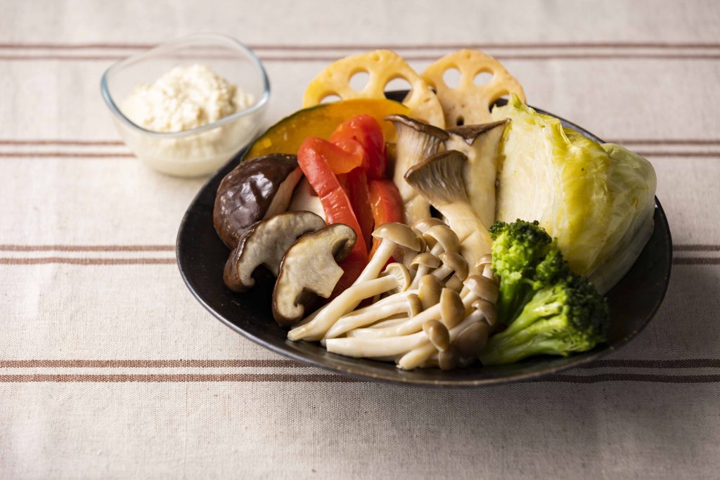 ①しいたけは石づきを取り半分に、ぶなしめじは石づきを取りほぐしておく。エリンギは4等分に切る。パプリカはスティック状に、かぼちゃはスライスする。すべての野菜ときのこを耐熱皿に並べて料理酒を振りかける。