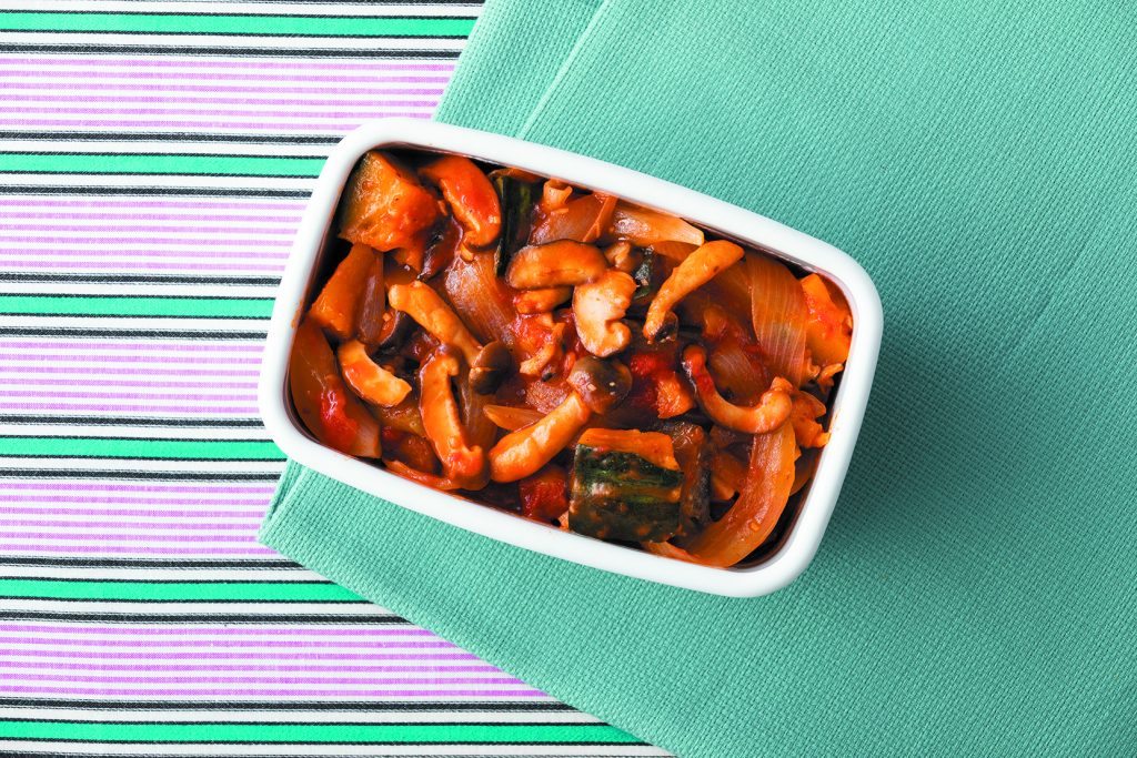 ②玉ねぎはスライスし、かぼちゃ、なすは一口大に切る。ぶなしめじは石づきをとり小房に分け、長ければ半分に切る。しいたけも石づきをとり、5mm幅にスライスする。ニンニクはみじん切りにする。