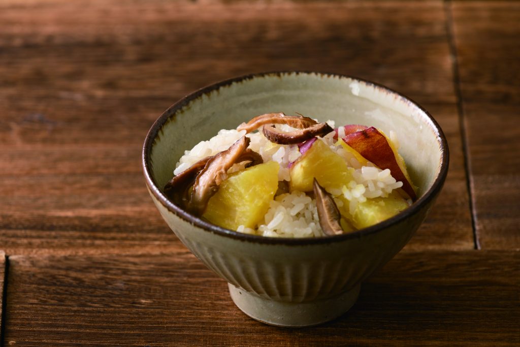 ②炊飯器にもち米、しいたけ、芋を入れ、だし昆布を上にのせる。1のしいたけの戻し汁(320ml )程度と酒を入れたら通常モードで炊く。器によそったら完成♪