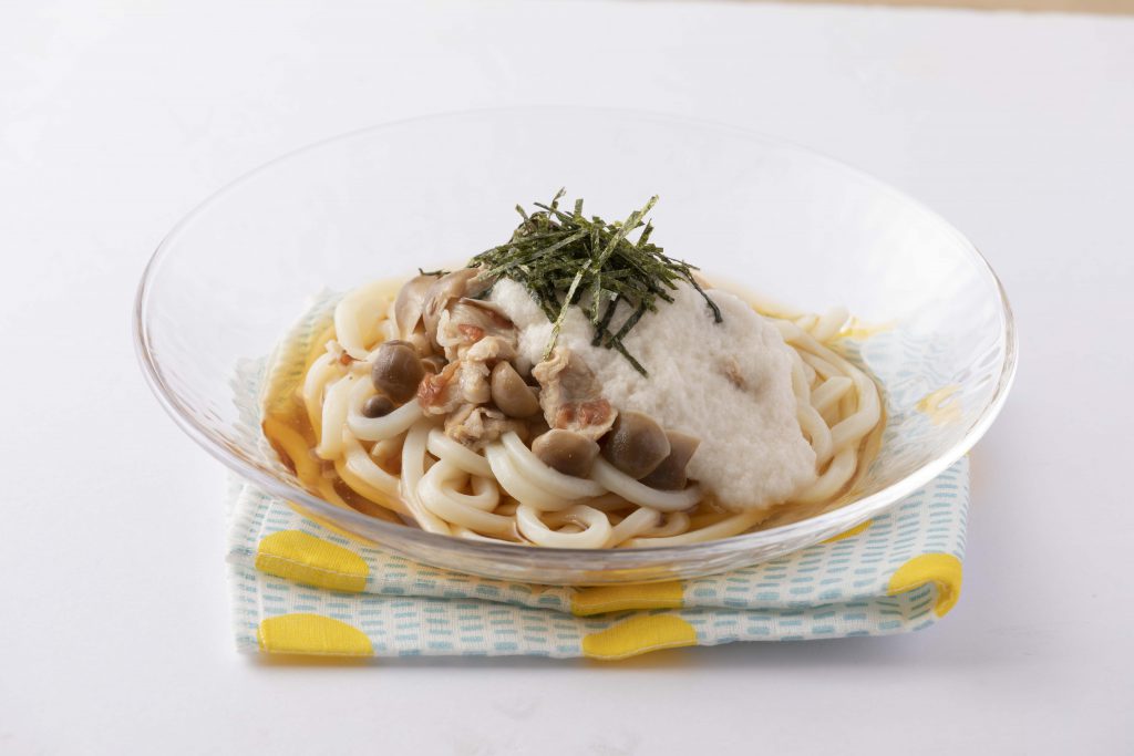 3 うどんを茹でて冷水でしめる。器に盛り付け、2、すりおろした山芋、刻み海苔、麺つゆをかける。