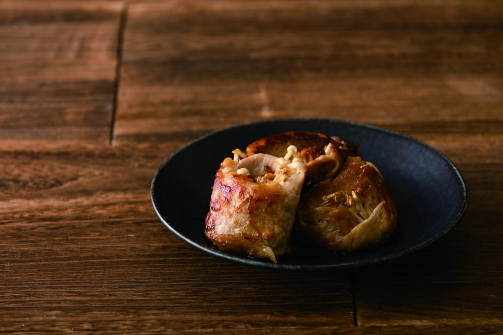 ①横向きにした豚肉を2~3枚縦につなげるように重ねて並べ、塩コショウを振る。えのきたけを肉の端に置き、しっかりと巻いていく。3等分に切り分けて小麦粉をまぶす。