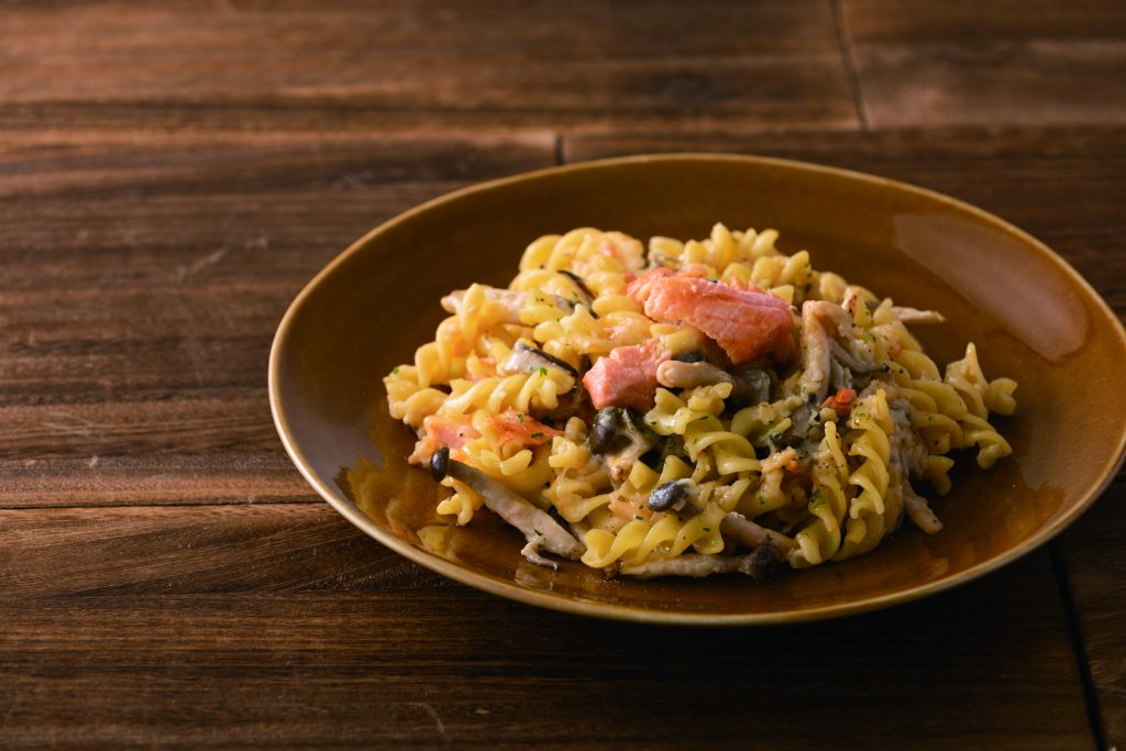 ②フライパンにオリーブオイルを入れて熱し、サーモンと白ワインを入れて焼く。火が通ったらいったん皿に引き上げ、同じフライパンできのこを炒める。コンソメと塩コショウを振り、豆乳と小麦粉を加えて粉っぽさがなくなるまでしっかりと混ぜ合わせ、とろみをつける。
