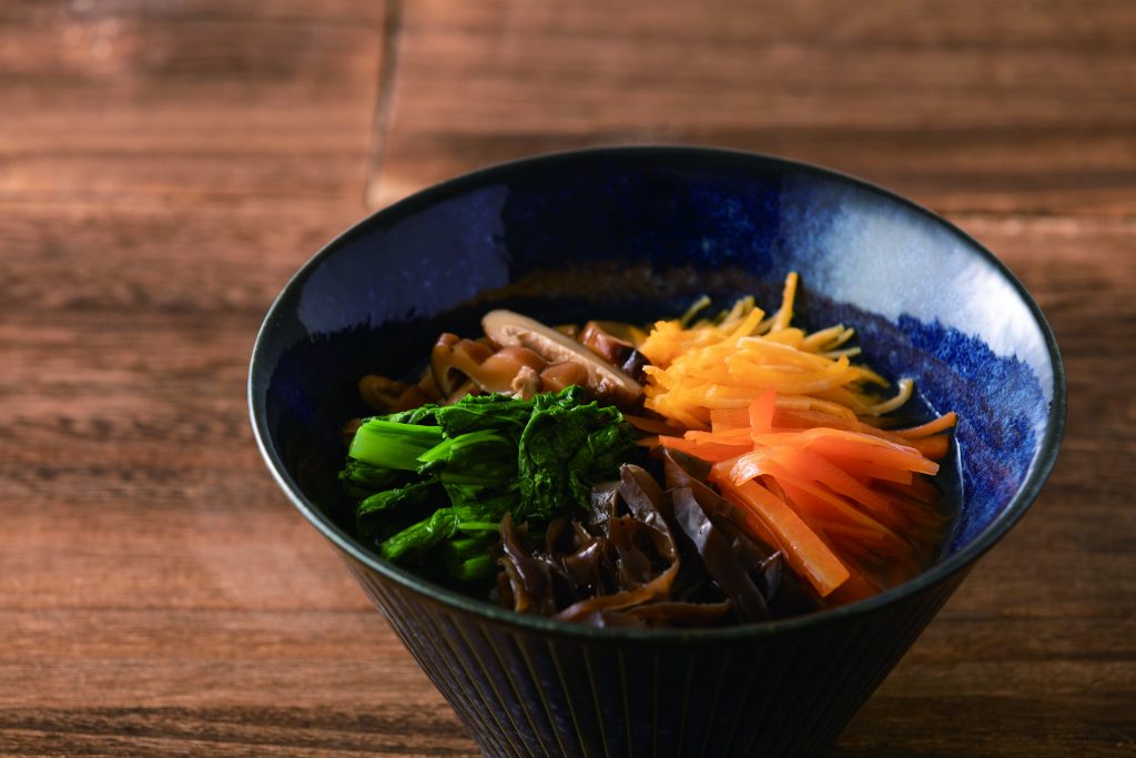 ①からし菜は、お湯で茹でて根元を切り、5cm幅で切り分ける。人参は千切りにする。ボウルに乾燥しいたけ・乾燥あらげきくらげを入れ、お湯で戻して5mm幅の千切りにする。きのこの戻し汁はとっておく。