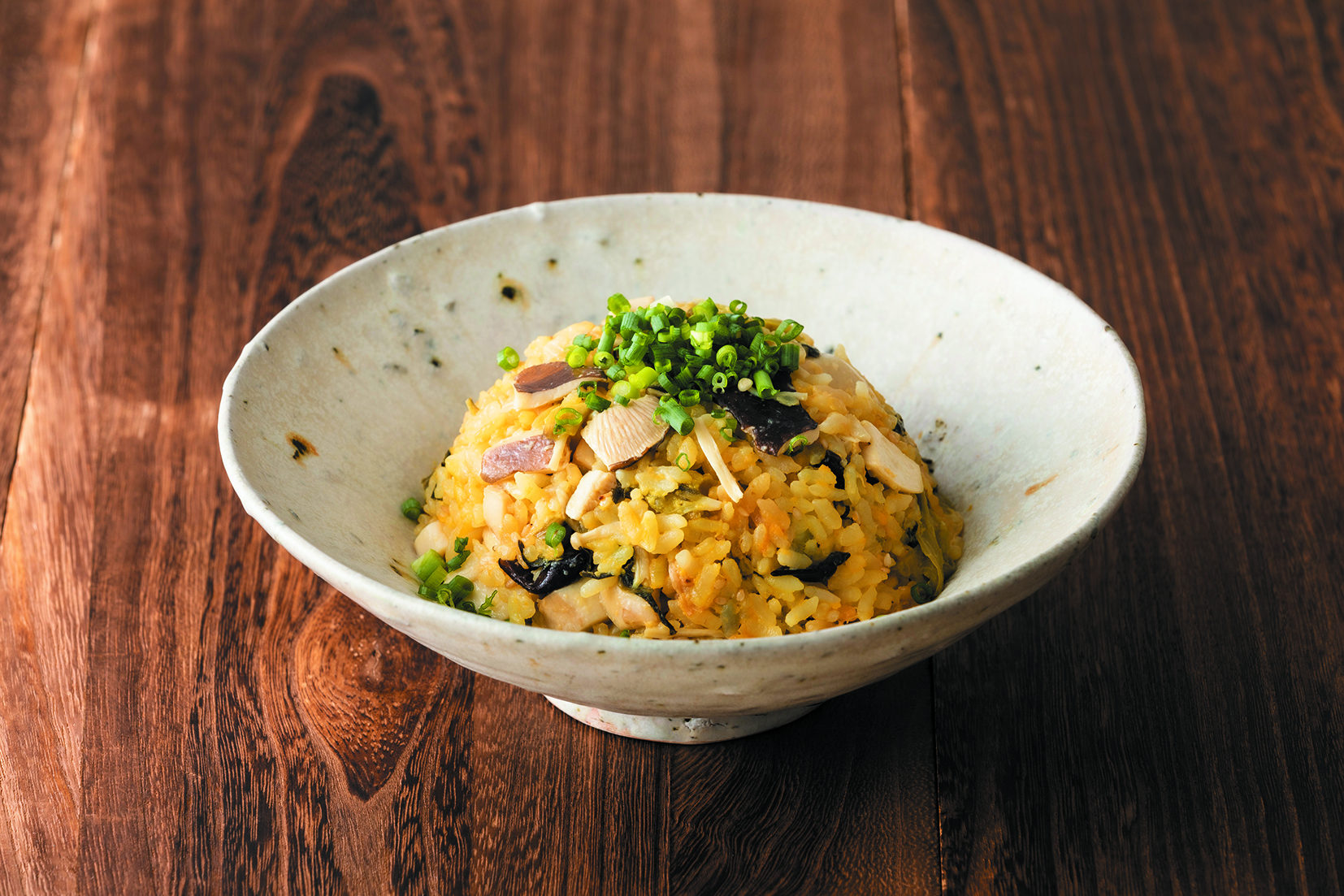 ③フライパンにごま油を中火で熱し、高菜漬けを入れて炒める。②を入れごはんをほぐしたら、きのこを加えて炒める。醤油、白いりごまを入れて味がなじんだら火を止める。器に盛り、刻みネギをのせて完成。