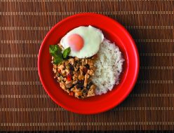 ②ボウルにごはん、溶き卵を入れて混ぜ合わせる。